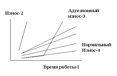 Рисунок 14.2.- Вид изнашивания поверхности втулки цилиндра при адгезионном износе. 1 - часы работы; 2 - износ; 3 - коррозионный или адгезионный износ; 4 - нормальный износ.