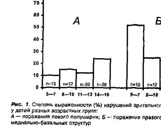 онтогенеза изменяется не только межполушарная, но и внутриполушарная организация зрительного восприятия. У детей 5—7 лет при локализации патологического процесса в задних и в передних отделах левого полушария не наблюдается существенных различий в выраженности зрительных дефектов. Но с возрастом происходит четкое увеличение частоты и степени выраженности оптических нарушений при поражении теменно-затылочных отделов левого полушария, в то время как при поражении лобно-височных зон изменения этих показателей являются незначительными. У детей с правополушарной Локализацией очага наблюдается иная закономерность. уже в дошкольном возрасте расстройства предметного гнозиса особенно отчетливы при поражениях задних отделов правого полушария, хотя и поражения лобно-височных областей в 5—7 лет приводят к грубым нарушениям зрительного восприятия. С возрастом доминирование теменно-затылочных зон правого, также как и левого полушария, становится еще более очевидным В отличие от взрослых больных, нарушения зрительного гнозиса у детей нередко возникают дри поражениях не только кортикальных, но и стволово-диэнцефальных структур мозга. У многих больных этой группы обнаруживаются грубейшие зрительные дефекты по типу фрагментарности восприятия предметных изображений, нарушений симультанного гнозиса и недостаточности наглядного контроля. Все эти нарушения выступают на фоне сохранности речевых и оп-тико-мнестичееких функций- Характер гностических нарушений при поражениях ствол оро-диэнцефальных структур у детей напоминает картину зрительных расстройств при поражениях правого полушария. Анализ показателей частоты и выраженности этих расстройств при поражениях стволово-диэнцефальных структур мозга у детей разных возрастных групп показал, что наиболее грубые дефекты зрительного гнозиса имели место у 5—7-летних детей; в более старших возрастных группах наблюдалось снижение этих показателей, и в 14—16 лет поражения этих структур вызывали лишь очень незначительные нарушения предметного восприятия (рис. 1, В). Полученные результаты позволяют сделать вывод о том, что на ранних возрастных этапах стволо-во-диэниефальные структуры мозга принимают участие в обеспечении процессов оптического гнозиса, но с возрастом ведущая роль в организации