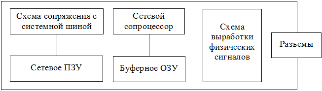 Качество написания программы драйвера во многом определяет эффективность работы сети в целом. Даже при самых лучших характеристиках сетевого адаптера некачественный драйвер может резко ухудшить обмен по сети. Прежде чем приобрести плату адаптера, необходимо ознакомиться со списком совместимого оборудования (Hardware Compatibility List, HCL), который публикуют все производители сетевых операционных систем. Выбор там довольно велик (например, для Microsoft Windows Server список включает более сотни драйверов сетевых адаптеров). Если в перечень HCL не входит адаптер какого-то типа, лучше его не покупать. Обобщённая структура сетевой карты представлена на рисунке 5.2.