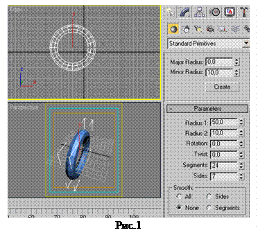 1. Настройка параметров визуализации. Команда меню Rendering (Визуализация)→ Render (Визуализировать), на вкладке Common (Общие) и установите значения размеров Width (Ширина) и Height (Высота) в разделе Output Size (Размеры вывода) равными 492х600. Позднее, когда будет выполняться заключительная визуализация, этот размер увеличим до 2738х3339, что соответствует размерам обрезки журнала, равным 91/8 ´ 111/8 дюйма (при разрешении равном 300 dpi). Меньший размер кадра значительно ускорит процесс контрольных (промежуточных) визуализаций. По завершении установки размеров щелкните на пиктограмме замка рядом с полем Image Aspect (Соотношение сторон изображения), чтобы зафиксировать пропорции. Закройте окно Render Scene (Визуализация сцены). 2. Активизировать окно перспективы и щелкнуть правой кнопкой мыши на названии окна проекций, чтобы открыть контекстное меню. Выбрать опцию Show Safe Frame (Показать безопасный кадр). Включение этой функции упростит композицию кадра впоследствии. 3. Сохраните файл, присвоив ему любое имя. 4. 5. Преобразуйте тор в объект Editadle Poly (Редактируемый многоугольник), нажав правую кнопку мыши на объекте и выберав Convert to → Convert to Editadle Poly (рис.2). Активизируйте режим подобъектов Polygon (Многоугольник) и выделите все многоугольники. В свитке Edit Polygons (Правка многоугольников) панели Modify (Изменить) щелкните на пиктограмме окна рядом с кнопкой Bevel (Скос), чтобы открыть диалоговое окно Bevel Polygons (Скос многоугольников). К выделенным (красного цвета) поверхностям применить два модификатора скоса. Первый вдавит многоугольники, а второй выдавит их наружу с уменьшением масштаба, образуя массив шипов. Для модификаторов скоса используйте следующие параметры: