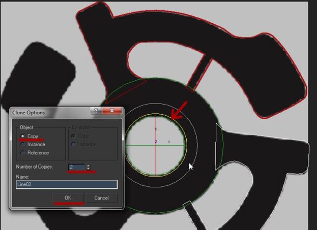 6. Временно забудем о кругах и выбрав Create --> Splines --> Line создадим форму прилегающую к кругу. Постарайтесь расположить примерно как на картинке ниже, а последнюю точку поставьте точно на первую и в появившемся окошке щелкните OK