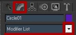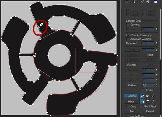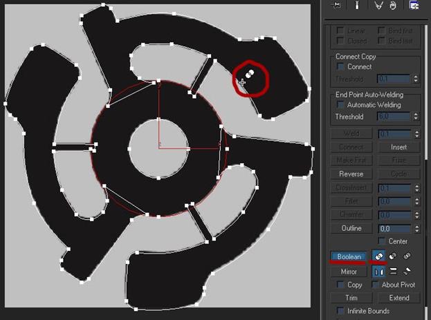 11. Снова переходим в режим редактирования сплайнов и выделяем большой круг, после в панели модификации находим кнопку Boolean и жмём на неё, далее нажимаем на одну из наших фигур