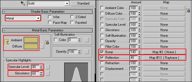 Создание материала «Золото». Шаг 25: Создадим золотой материал для нашей модели! Выберите стандартный материал и поменяйте шейдер на Metal Выберите RGB (203,189,114) в качестве цвета Ambient и Diffuse Установите уровень Specular на 80 и Glossiness на 60. Используйте Raytrace в качестве Reflection Map (40) и Noise для Bump'а. (140)