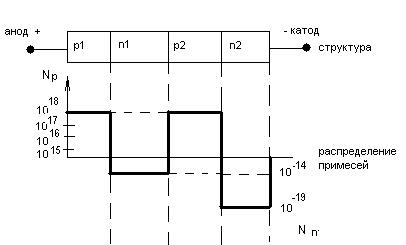 Исследование тиристоров и управляемых выпрямителей ЛАБОРАТОРНАЯ РАБОТА 4. Цель лабораторной работы: Экспериментальное получение характеристик тиристора. Тиристор – полупроводниковый прибор с двумя устойчивыми состояниями, имеющий три и более p-n переходов, который может переключаться из закрытого состояния в открытое и наоборот. С эксплуатационной точки зрения тиристор – это полупроводниковый ключ, основное назначение которого – замыкание и размыкание цепей. Он может находиться в любом состоянии бесконечно долго. Переход из одного состояния в другое происходит сравнительно быстро. Основой тиристора является четырехслойная структура полупроводников различной проводимости – p-n-p-n. Вывод с р -примесью называется анодом, с п -примесью – катодом. Количество примесей в р и п слоях различна, что представлено на графике.