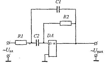 рис. 9.4. Обратная связь усилителя содержит: RICI - интегрирующую цепочку, R2С2-дифференцирующую цепочку. Квазирезонансная частота: