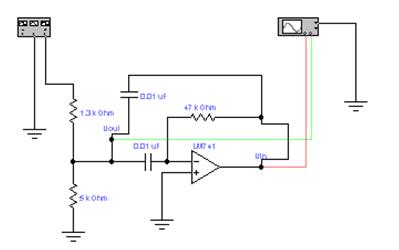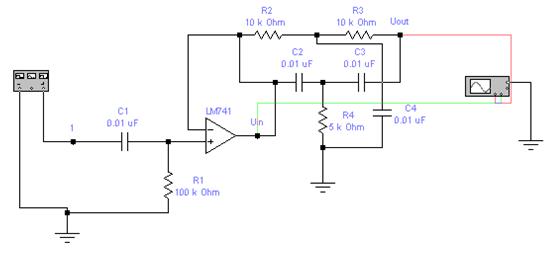 Рис. 9.5 2. Установить параметры функционального генератора: частота 2.5 кГц, амплитуда 0.7В, подключить входы осциллографа к точкам Uin и Uout, включить схему. 3. Изменять частоту генератора от 2.5 кГц до 1.5 кГц с шагом 100Гц. Наблюдать по осциллографу за изменением амплитуды сигнала на выходе из фильтра Uвых.ф, при минимальной амплитуде зафиксировать частоту сигнала. Это будет квазирезонансная частота фильтра 4. Устанавливать частоты относительно резонансной: 5 значений больше и 5 значений меньше с шагом 100Гц. Для каждого значения частоты измерять по расширенной модели осциллографа амплитуды входного и выходного сигналов. Результаты измерений записать в таблицу 1. Вычислить коэффициент передачи фильтра β. Табл 1