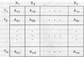 Рис. 1. Объектная структура данных: Yi — вектор-строка данных, полученных от i-ro индивида по п характеристикам, Xj — вектор-столбец данных, полученных по j-й характеристике от m индивидов. ние графическая иллюстрация модели многокомпонентного вектора в форме «профиля» — уровень выраженности отдельной характеристики визуализируется в форме подъемов и падений ломанной линии в точке, соответствующей данной характеристике (параметру) на нумерационной шкале параметров (см. рис. 2).