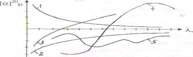 Мерой оптически активности вещества является угол вращения плоскости поляризации a. Он зависит от толщины слоя l и индивидуальных свойств оптически активного вещества: a= [a]tlld (1) где [a]tl-удельное вращение плоскости поляризации, градус; 1 - толщина слоя, (длина кюветы); d - плотность вещества, г/см3. Для растворов угол вращения плоскости полярицации зависит от концентрации оптически активного вещества. Каждое растворенное оптически активное вещество характеризуется определенным удельным вращением, т.е. углом вращения плоскости поляризации при температуре t в монохроматическом свете с длиной волны l раствором, содержащим 100 г вещества в 100 мл раствора, причем луч проходит в таком растворе путь, равный 100 мм. [a]tl = 100a/cl, (2) a-угол вращения плоскости поляризации, град.; с- концентрация раствора, г/100 мл; l- толщина слоя раствора (длина поляриметрической трубки). Вместо удельного вращения для характеристики оптической активности используют молярное вращение [М]tl =[a]tl * М/100 (3) М-молекулярная масса оптически активного вещества. Чаще удельное вращение плоскости поляризации определяют при 200 и l=589,5 для желтой линии натрия. Удельное вращение плоскости поляризации жидких и твердых оптически активных веществ при определенных условиях измерения является величиной постоянной, т.е. его справочной характеристикой.Хотя для некоторых веществ наблюдается так называемое явление мутаротации, т.е. изменение удельного вращения вследствии перехода вещества из одной таутомерной формы в др. Зависимость величины удельного вращения плоскости от длины волны поляризованного света называется дисперсией оптического вращения (ДОВ). Чаще всего абсолютное значение удельного мольного вращения плоскости поляризации с увеличением длины волны уменьшается, и кривые ДОВ имеют вид: