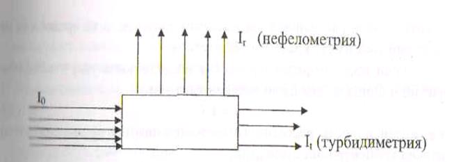 Физ. основы нефелометрии и турбидиметрии. Рассеяние и поглощение светаНефелометрический и турбидиметрический методы анализа основаны на явлении рассеянии или поглощения светатвердыми или коллоидными частицами,находящимися в жидкой фазе во взвешенном состоянии. Если световой поток интенсивностью Iо падает на кювету с раствором, то часть этогопотока Ik отражается от стенок кюветы и поверхности раствора,часть его Iа поглощаетсямолекулами вещества, I содержащегося врастворе, и расходуется на изменение электронной и вращательной энергии этих молекул, часть энергии Iа, поглощаетсямолекулами самого растворителя. Если свет с интенсивностью I0 проходит через дисперсную систему (эмульсию, суспензию), то к оптическим явлениям, перечисленным выше, добавляетсярассеяние и поглощение света дисперсными частицами (рис. 1). В направлении, перпендикулярном к падающему свету, будет наблюдаться рассеянный световой поток с интенсивностью Ir; в направлении, совпадающем с направлением падающего светового потока, за кюветой с исследуемым раствором — ослабленный световой поток с интенсивностью It.