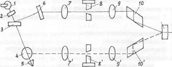 Рис. 26. Схема нефелометра НФМ заполненную исследуемым раствором. Световой поток, выходящий из кюветы, гасится в ловушке света 5. Часть света, отраженная частицами, находящимися в растворе, проходит через линзу 7, уравнительную диафрагму 8', линзу 9' и при помощи ромбической призмы 10' направляется через светофильтр 11 в окуляр 12, освещая одну половину оптического ноля. Световой поток от рассеивателя 6 проходит такой же путь через линзу 7, уравнительную диафрагму 8, линзу 9, ромбическую призму 10, светофильтр 11 и попадает в окуляр 12, освещая вторую половину оптического поля. При проведении нефелометрического измерения исследуемый раствор наливают в кювету 4, устанавливают барабаны уравнительных диафрагм 8 и 8', изменяя размеры их щелей. Проделав подобные измерения для ряда растворов, содержащих определенные концентрации исследуемого вещества, строят калибровочный график зависимости показаний уравнительной диафрагмы от концентрации растворов. Используя этот график, по показаниям уравнительной диафрагмы определяют концентрацию анализируемого раствора. Ошибка при проведении нефелометрических измерений достигает 10-15% и складывается из ошибки проведения самого измерена и ошибки при подготовке раствора к анализу. Нефеломечрический метод анализа применяется довольно редко из-за трудности получения стабильных взвесей с постоянным размером частиц.