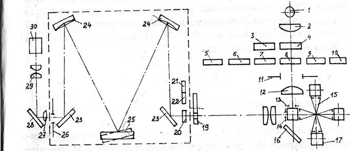 Ветвь флуоресцентного излучения, т. Н. измерительная ветвь, расположена под углом 90° к направлению возбуждающего излучения. Для уменьшения рассеяния света перед кюветой на входе и выходе установлены ограничительные диафрагмы 1З и 14. Изображение светящегося объема люминесцирующего вещества из центра кюветы передается на входную щель 20 монохроматора. Перед входной щелью 20 установлено модулирующее устройство - обтюратор 19 -диск с отверстием, вращающийся с определенной скоростью. Благодаря о6тюратору непрерывный световой поток люминесценции преобразуется в прерывистый, что необходимо для получения на выходе из прибора переменного электрического тока. Монохроматор в данном приборе работает по симметричной схеме с двумя сферическими объективами 24 (т.н. схема Черни-Тернера). Этот блок предназначен для выделения из потока флуоресцентного излучения лучей с определенной длиной волны, на которой проводится измерение. Поток флуоресцентного излучения, пройдя входную щель 20 и фильтры 21, 22, устраняющие наложение спектров разных порядков, попадает на поворотное зеркало 23, направляющее его на объектив -24. Этот объектив направляет полихроматический пучок на диспергирующий элемент монохроматора - дифракционную решетку 25, имеющую 600 штрих./мм. На дифракционной решетке полихроматическое излучение разлагается на составляющие его монохроматические компоненты. Выделение требуемой волны диапазона 400-800 нм производится поворотом дифракционной решетки, выделенное излучение фокусирующим объективом 24 направляется на поворотное зеркало 23 и через выходную щель 26 - на фотоприемник 30. Линза 27, зеркало 28 и объектив 29 предназначены для фокусировки выходящего светового пучка на катоде фотоприемника 30, в качестве которого в приборе ФЛ используется фотоумножитель ФЭУ-79. Измерительным прибором является микроамперметр со шкалой 0-100 мкА.