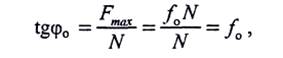 При скольжении одного тела по поверхности другого сила трения направлена противоположно относительной скорости и равна произведению динамического коэффициента трения f на величину нормальной силы реакции. Динамический коэффициент трения/несколько меньше статического В случае предельного равновесия сила трения достигает своего максимального значения, реакция R отклонена от нормали на наибольший угол ф0. Этот наибольший угол фо называется углом трения. Из рис. 1.52 следует, что