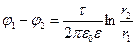 Цилиндрический конденсатор - это два полых коаксиальных проводящих цилиндра с радиусами r1 и r2 (r1>r2), между которыми находится диэлектрик с диэлектрической проницаемостью e. Согласно (11.36) разность потенциалов между обкладками конденсатора