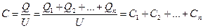 т.е. общая ёмкость равна сумме ёмкостей. При последовательном соединении (рис. 13.5) заряды конденсаторов одинаковы: Q1=Q2…=Qn, а напряжения складываются: