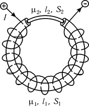 Рассмотрим магнитное поле, создаваемое током I в тороиде, из которого удален небольшой участок длиной lz (рис. 17.15). В этом случае значения вектора магнитной индукции внутри тороида и на выделенном участке будут различными, поскольку значения магнитной проницаемости сердечника тороида m1 и удаленного участка m2 не одинаковы; отличаются также сечения тороида S1 и выделенного участка S2. В этом случае интеграл в выражении для циркуляции вектора магнитной индукции (см. (17.28)) необходимо разбить на две части: