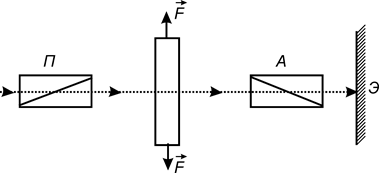 Прозрачные изотропные среды (газы, жидкости, аморфные твердые тела) не обладают свойством двойного лучепреломления. Однако под влиянием внешних воздействий (механические напряжения, электрические и магнитные поля) они становятся анизотропными и для них возникает двойное лучепреломление. Это явление называется искусственной оптической анизотропией. Рассмотрим основные виды этого явления. 1. Искусственная анизотропия при механической деформации. Поместим между скрещенными поляризатором и анализатором пластинку из стекла или оргстекла. Если пластинка не деформирована, то свет через такую систему не проходит. Подвергнем пластинку сжатию или растяжению (рис. 27.10). В результате на экрана будет наблюдаться картина, испещренная цветными полосами. Каждая такая полоса соответствует местам, где напряжение s одно и то же.