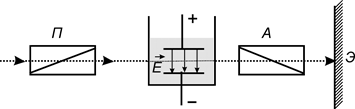 Схема установки для наблюдения эффекта Керра изображена на рис.27.11. Установка состоит из ячейки Керра, помещенной между скрещенными поляризатором и анализатором. Ячейка Керра представляет собой плоский конденсатор, находящийся в сосуде с жидкостью. Если электрическое поле отсутствует, то свет через такую систему не проходит. При включении электрического поля жидкость приобретает свойства одноосного кристалла с оптической осью, направленной вдоль вектора напряженности