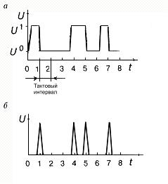 Рис.1. Потенциальный цифровой сигнал (а), импульсный цифровой сигнал (б) для двоичного числа 10011010