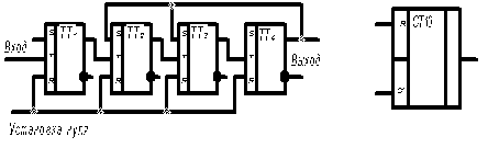 Цифровым счетчиком импульсов называют устройство, реализующее счет числа входных импульсов и фиксирующее это число в каком-либо коде. Обычно счетчики строят на основе триггеров, поэтому счет импульсов ведется в двоичной системе счисления. Для получения счетчика, работающего в десятичном коде, применяют обратные связи. На рисунке 1 приведена функциональная схема десятичного (декадного) счетчика импульсов на четырех триггерах и его условное обозначение.