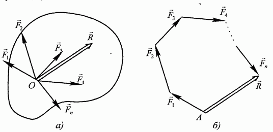 Вычисление и построение равнодействующей сходящихся сил осуществляется по правилам векторной алгебры. Это можно сделать геометрическим и аналитическим способами. При геометрическом способе строится векторный (силовой) многоугольник, замыкающая сторона которого и определяет вектор равнодействующей (рис. 25, б). Перенеся этот вектор параллельно себе в точку О пересечения линий действия сил, получаем искомую равнодействующую (см. рис. 25, а).