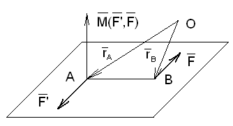 Формула (6) совпадает с третьей формулой (2). Поэтому момент силы относительно оси можно вычислять либо по формулам (2), либо по алгоритму, приводящему к равенству (3). Из этого равенства видно, что момент силы относительно оси равен моменту проекции вектора силы на любую плоскость, перпендикулярную этой оси, относительно точки пересечения оси с указанной плоскостью. Формула (3) показывает, что момент силы относительно оси равен нулю, если линия действия силы пересекает эту ось (в этом случае 5. Пара сил и её свойства. Рассмотрим две силы