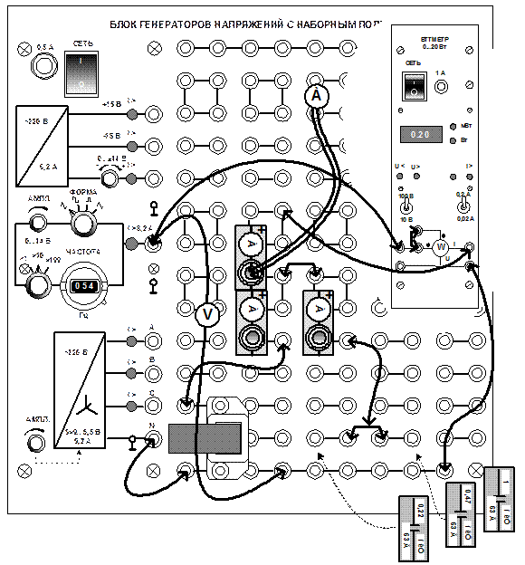 Экспериментальная часть Задание Определить экспериментально параметры катушки индуктивности, рассчитать резонансную ёмкость параллельно включенного конденсатора, снять зависимость токов в цепи от ёмкости, построить векторные диаграммы для трёх случаев С<Cрез, С=Срез и С>Cрез. · Соберите цепь (принципиальная схема рис. 8.2, монтажная – 8.3), включив в каждую ветвь по миниблоку для подключения амперметра. Конденсаторы в первом опыте не включайте.