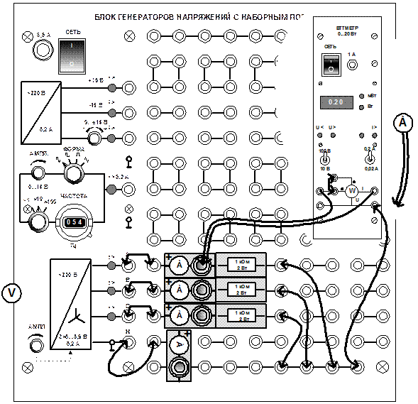 · Соберите цепь с симметричной активной нагрузкой (RA = RB = RC = 1 кОм ) согласно принципиальной схеме (рис. 9.1) и монтажной схеме (рис.9.4). · Измерьте напряжения и токи на нагрузке в схеме с нейтральным проводом и вычислите мощности. Результаты измерений и вычислений занесите в табл. 9.1. · Подключая ваттметр сначала в фазу А, затем в фазу В и, наконец, в фазу С измерьте мощности трёх фаз и вычислите суммарную мощность. Результаты запишите в также в табл. 9.1. (Для переключения ваттметра из одной цеп в другую, также как и амперметра, используйте специальный коммутационный миниблок «амперметр» и пару проводников с коаксиальным разъёмом!). Проверьте баланс мощностей, т.е. сравните суммарную измеренную мощность с суммой рассчитанных фазных мощностей. · Уберите из схемы нейтральный провод (перемычку между точками N и 0) и снова измерьте токи и напряжения. · Подключая токовую цепь ваттметра сначала в фазу А, а цепь напряжения – на напряжение UAB, затем токовую цепь в фазу C, а цепь напряжения – на напряжение UCB, измерьте две мощности и вычислите суммарную мощность. Проверьте баланс мощностей.