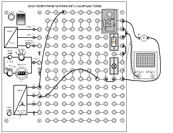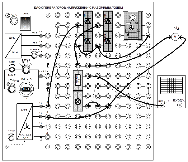 Экспериментальная часть Задание С помощью осциллографа и мультиметра снять экспериментально регулировочные характеристики однополупериодного и двухполупериодного управляемых выпрямителей, пронаблюдать на осциллографе за изменением напряжения на выходе тиристорного регулятора переменного напряжения. · Соберите цепь однополупериодного выпрямителя на тиристоре согласно монтажной схеме (рис. 17.5) и установите максимальную амплитуду трёхфазного источника, от которого питается цепь. В качестве нагрузки в цепь включена лампочка накаливания и токоограничивающее сопротивление 47 Ом. Для наблюдения кривой выпрямленного напряжения и измерения угла задержки включения тиристора a параллельно нагрузке подключён осциллограф, а для измерения среднего значения выпрямленного напряжения – вольтметр.