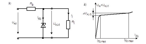 Исследование стабилизаторов постоянного напряжения Стабилизаторы напряжения предназначены для стабилизации напряжения на нагрузке при изменениях напряжения источника питания и (или) тока нагрузки. По принципу действия различают параметрические и компенсационные стабилизаторы напряжения. Простейший параметрический стабилизатор напряжения состоит из балластного резистора R б и стабилитрона Д (рис.19.1а). Вольтамперная характеристика стабилитрона имеет почти горизонтальный участок (рис.19.1б), на котором напряжение очень мало изменяется при изменении тока от минимально допустимого тока стабилизации I ст min. до максимально допустимого I ст max. При широком изменении входного напряжения или тока нагрузки изменяется ток в стабилитроне, тогда как напряжение на стабилитроне, а стало быть, и на нагрузке изменяется мало.