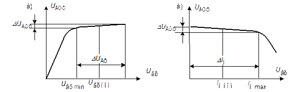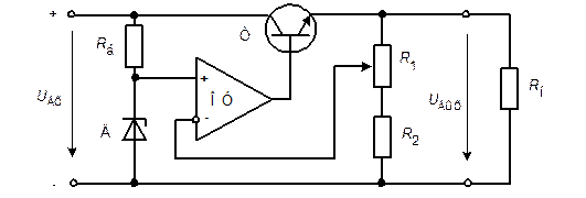Рис.19.2 Регулирующим элементом является транзистор Т, а в качестве опорного напряжения используется выходное напряжение параметрического стабилизатора (R б и Д). Сравнение опорного напряжения с частью выходного напряжения происходит в операционном усилителе ОУ. Как только эта часть выходного напряжения, по какой либо причине превысит опорное напряжение, операционный усилитель вырабатывает сигнал, закрывающий транзистор. Наоборот, когда напряжение на выходе уменьшается, операционный усилитель открывает транзистор. Потенциометр R 1 позволяет изменять ту часть выходного напряжения, которая сравнивается с опорным напряжением, т.е. задавать величину выходного напряжения стабилизатора. В реальных стабилизаторах при уменьшении входного напряжения U ВХ выходное напряжение U ВЫХ также уменьшается, хотя и в меньшей степени. Однако, ниже некоторого минимального значения входного напряжения стабилизация прекращается и выходное напряжение уменьшается пропорционально входному. Аналогично, при увеличении тока нагрузки I н выходное напряжение стабилизатора сначала незначительно уменьшается, а после превышения некоторого максимально допустимого тока резко падает. Характер изменения U ВЫХ от U ВХ и от I н показан на рис. 19.3а и б.