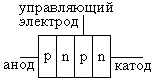 Тиристор - это полупроводниковый прибор с тремя p-n переходами и тремя выводами, которые называются анод, катод и управляющий электрод (рис. 4.1, 4.2). Цепь анод-катод служит для пропускания основного тока тиристора. Через управляющий электрод и катод проходят управляющие импульсы. Тиристоры обычно применяют для управления напряжением и током различных нагрузок, чаще всего для изготовления выпрямителей с регулируемым напряжением мощной нагрузки. Тиристор - переключающий прибор. Он может быть только в одном из двух состояний: в открытом, в котором он пропускает ток в цепи анод-катод, и в закрытом, в котором он не пропускает ток в этой цепи. Если потенциал катода больше, чем потенциал анода, то тиристор будет закрыт. Если потенциал анода больше, чем потенциал катода, то тиристор будет закрыт до тех пор, пока не произойдет одно из двух событий: напряжение анод-катод превысит прямое напряжение пробоя или в цепи управляющий электрод-катод будет пропущен отпирающий импульс. После этого тиристор переходит в открытое состояние и остается в нем, пока ток в цепи анод-катод по каким-либо не зависящим от тиристора причинам не станет меньше значения, называемого током удержания.