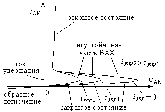 Основными характеристиками тиристора являются: максимальное прямое напряжение - это напряжение анод-катод, при котором тиристор без управляющих импульсов гарантированно остается в закрытом состоянии; максимальный прямой ток; прямое напряжение (порядка 1-2 В) - это напряжение анод-катод в открытом состоянии при максимальном токе; обратный ток - это слабый ток утечки при включении тиристора в обратной полярности на максимальное напряжение; ток управления и напряжение управления - это ток и напряжение, которые должен обеспечивать источник управляющих импульсов. Многослойные полупроводниковые приборы бывают разных типов: тиристоры с анодным управлением - у них открывающий импульс пропускается по цепи управляющий электрод-анод, динисторы - они не имеют управляющего электрода и включаются при определенном напряжении анод-катод, симисторы - у них четыре p-n перехода и симметричная ВАХ, выключаемые тиристоры - с электродом для выключающего импульса, и т.д. В настоящее время тиристоры все больше уступают место транзисторам, более удобным в управлении и превосходящим тиристоры по быстродействию.