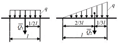 Рис. 1.1 Распределенную нагрузку в виде прямоугольника (равномерно распределенная нагрузка) или треугольника заменяют одной силой (равнодействующей), которую прикладывают в центре тяжести площади распределения (рис. 1.1, б). Величина равнодействующей численно равна площади фигуры, образованной распределенной нагрузкой:
