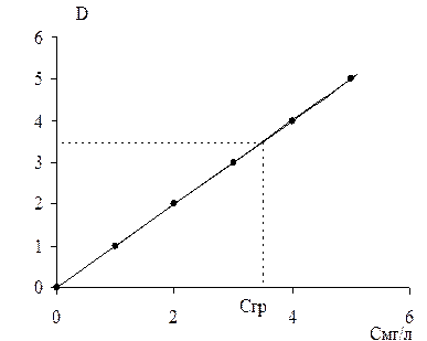 По полученным значениям на миллиметровой бумаге строят калибровочный график (рисунок 5) в координатах оптическая плотность D по оси y и концентрация (С, г/л) по оси х. Получают прямую линию, выходящую из нуля. Если линия не выходит из нуля, необходимо приготовить раствор сравнения, в состав которого входят все компоненты, кроме сульфата кальция. Для этого раствора измеряют коэффициент светопропускания Т и рассчитывают оптическую плотность. В таком случае график будет выходить из точки, соответствующей оптической плотности раствора сравнения.