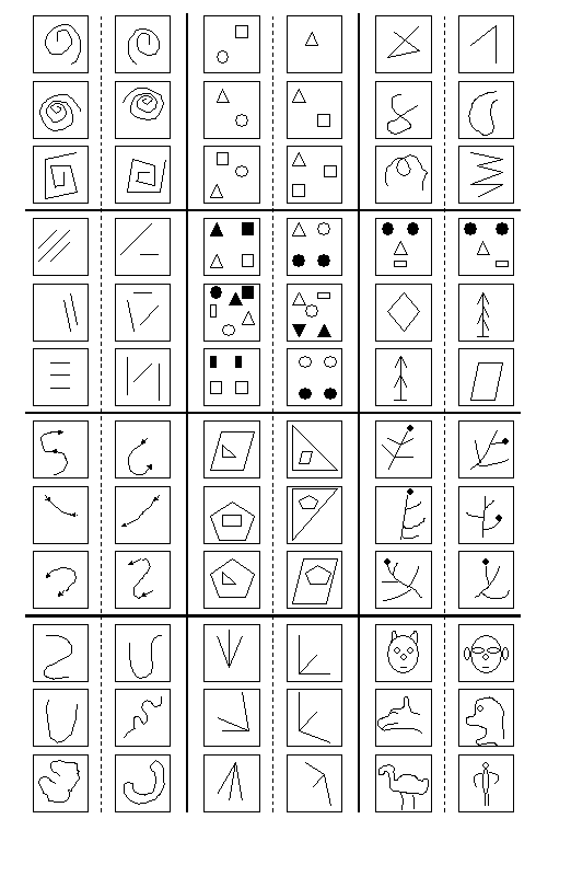 Здесь представлены 12 задач, в которых следует отобрать признаки, при помощи которых можно отличить левую триаду картинок от правой. Решение данных задач требует моделирования логического мышления в полном объеме. В целом проблема распознавания образов состоит из двух частей: обучения и распознавания. Обучение осуществляется путем показа отдельных объектов с указанием их принадлежности тому или другому образу. В результате обучения распознающая система должна приобрести способность реагировать одинаковыми реакциями на все объекты одного образа и различными — на все объекты различных образов. Очень важно, что процесс обучения должен завершиться только путем показов конечного числа объектов без каких-либо других подсказок. В качестве объектов обучения могут быть либо картинки, либо другие визуальные изображения (буквы), либо различные явления внешнего мира, например звуки, состояния организма при медицинском диагнозе, состояние технического объекта в системах управления и др. Важно, что в процессе обучения указываются только сами объекты и их принадлежность образу. За обучением следует процесс распознавания новых объектов, который характеризует действия уже обученной системы. Автоматизация этих процедур и составляет проблему обучения распознаванию образов. В том случае, когда человек сам разгадывает или придумывает, а затем навязывает машине правило классификации, проблема распознавания решается частично, так как основную и главную часть проблемы (обучение) человек берет на себя. Проблема обучения распознаванию образов интересна как с прикладной, так и с принципиальной точки зрения. С прикладной точки зрения решение этой проблемы важно прежде всего потому, что оно открывает возможность автоматизировать многие процессы, которые до сих пор связывали лишь с деятельностью живого мозга. Принципиальное значение проблемы тесно связано с вопросом, который все чаще возникает в связи с развитием идей кибернетики: что может и что принципиально не может делать машина? В какой мере возможности машины могут быть приближены к возможностям живого мозга? В частности, может ли машина развить в себе способность перенять у человека умение производить определенные действия в зависимости от ситуаций, возникающих в окружающей среде? Пока стало ясно только то, что если человек может сначала сам осознать свое умение, а потом его описать, т. е. указать, почему он производит действия в ответ на каждое состояние внешней среды или как (по какому правилу) он объединяет отдельные объекты в образы, то такое умение без принципиальных трудностей может быть передано машине. Если же человек обладает умением, но не может объяснить его, то остается только один путь передачи умения машине — обучение примерами. Круг задач, которые могут решаться с помощью распознающих систем, чрезвычайно широк. Сюда относятся не только задачи распознавания зрительных и слуховых образов, но и задачи распознавания сложных процессов и явлений, возникающих, например, при выборе целесообразных действий руководителем предприятия или выборе оптимального управления технологическими, экономическими, транспортными или военными операциями. В каждой из таких задач анализируются некоторые явления, процессы, состояния внешнего мира, всюду далее называемые объектами