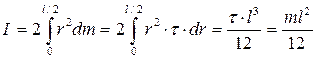 Далее вычисляют моменты инерции некоторых тел правильной формы. 1. Тонкий однородный стержень (длина l, масса m, Þ линейная плотность t=m/l=const): а) ось вращения ОО/ проходит перпендикулярно стержню через его центр масс С (рис. 4.2).