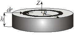 Рис. 4.5 Рис. 4.6 4. Однородный диск или сплошной цилиндр (масса m, радиус R, объемом V).Начало координат (пересечение) трех взаимно перпендикулярных осей располагают в центре масс цилиндра (можно аналогично случаю 2, а) сместить все вещество вдоль оси ОZ, т.е. получить тонкий диск малой толщины h/, плотности r=m/V¢, V¢=p×R2 h¢ – объем после смещения, см. рис. 4.6), для которого
