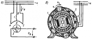 Характеристики синхронного генератора. Характеристика холостого хода Е =ƒ(IВ), при разомкнутой внешней цепи т.е. IН = 0, где Е - ЭДС статора, IВ - ток возбуждения. Внешняя характеристика U = ƒ(IЯ) определяется основным уравнением генератора и снимается при изменении тока нагрузки (тока якоря), при постоянном токе возбуждения (IВ) и коэффициенте мощности нагрузки (cosφнагр). Внешняя характеристика описывается основным электрическим уравнением синхронного генератора U = E – IЯ·RЯ – IЯ·xЯ , (3) где U – напряжение на обмотке якоря; Е – ЭДС якоря; IЯ·RЯ и IЯ·хЯ соответственно активное и реактивное падение напряжения в якоре; IЯ – ток якоря, одновременно являющийся током нагрузки. На внешнюю характеристику, оказывает влияние реакция якоря. При возникновении токов в обмотке якоря возникает, помимо основного, дополнительное магнитное поле якоря (поле статора). Реакцией якоря называется влияние магнитного поля статора на основное поле ротора. В генераторе эффект реакции якоря зависит не только от его величины, но и от характера нагрузки, т.е. от того, будет ли нагрузка генератора активной или реактивной (отстающей или опережающей). Если нагрузка имеет активный характер (R), то основное магнитное поле машины под действием поля якоря почти не изменяется по величине. В случае активно-индуктивной нагрузки (R,L) поле якоря направлено против основного поля, при этом машина размагничивается, следовательно, уменьшается ЭДС якоря. Регулировочная характеристика. Регулировочная характеристика представляет собой зависимость тока возбуждения от тока нагрузки при неизменных значениях напряжения на зажимах генератора, скорости вращения и cosφ, т.е.: IВ = ƒ(IН), при U = const, cosφнагр = const и n = const, где IВ – ток возбуждения генератора, IН – ток нагрузки. Практически при эксплуатации синхронных генераторов необходимо поддерживать на их зажимах неизменное напряжение независимо от величины и вида нагрузки. Регулировочная характеристика показывает, как надо изменять ток в цепи возбуждения, чтобы с изменением нагрузки на генератор напряжение на его клеммах оставалось неизменным. Синхронный двигатель может работать в качестве генератора и двигателя. Синхронный двигатель выполнен так же, как и синхронный генератор. Его обмотка якоря I (рис. 291, а) подключена к источнику трехфазного переменного тока; в обмотку возбуждения 2 подается от постороннего источника постоянный ток. Благодаря взаимодействию вращающегося магнитного поля 4, созданного трехфазной обмоткой якоря, и поля, созданного обмоткой возбуждения, возникает электромагнитный момент М (рис. 291,б), приводящий ротор 3 во вращение. Однако в синхронном двигателе в отличие от асинхронного ротор будет разгоняться до частоты вращения n = n1, с которой вращается магнитное поле (до синхронной частоты вращения). Объясняется