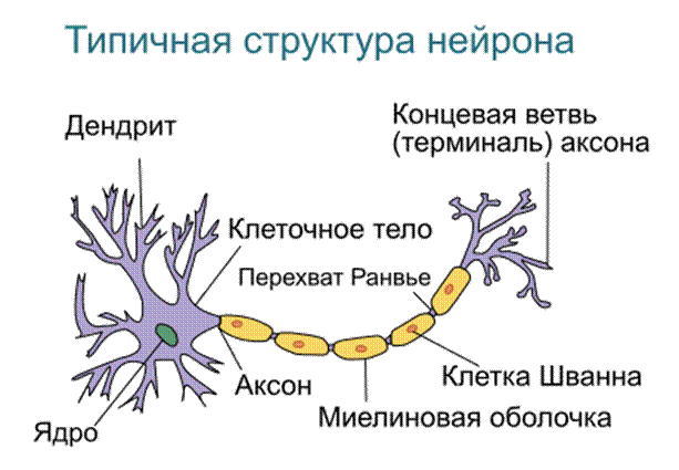Установлено, что поздняя миелинизация нейронов, продолжающаяся у человека даже во взрослом возрасте, сильно отличает его от шимпанзе и других приматов Миелин прерывается только в области перехватов Ранвье, которые встречаются через правильные промежутки длиной примерно 1 мм. В связи с тем, что ионные токи не могут проходить сквозь миелин, вход и выход ионов осуществляется лишь в области перехватов. Это ведёт к увеличению скорости проведения нервного импульса. Таким образом, по миелинизированным волокнам импульс проводится приблизительно в 5—10 раз быстрее, чем по немиелинизированным. · Длинные миелиновые проводящие пути формируют булое вещество, а тела нейроны + кровеносные сосуды формируют серое вещество · Нейроны могут быть высоко специфичны и направлены на восприятие одно признака информации. Могут быть мультимодальными (зрительные, вкусовые – реагируют на определенное кол-во стимулов) · Существуют зеркальные нейроны. Нейроны головного мозга, которые возбуждаются как при выполнении определённого действия, так и при наблюдении за выполнением этого действия другим существом. У людей активность мозга, согласующаяся с поведением зеркальных нейронов, первоначально была обнаружена в лобной и теменной областях косвенными методами, такими как МРТ и электроэнцефалография. Позволяют сопереживать и проникаться проблемой другого человека (из тетради) Их патология -> аутизм(одна из теорий) · Нейроны внимания хрен знает что это в инете и учибнике нигде нет · Когнитивные процессы обусловлены возбуждением одновременно разнообразных видов нейронов всей целой нервной системы! 5) ХАРАКТЕРИСТИКА Нервная ткань и ее основная характеристика (раздражимость возбудимость проводимость и рективность – в тетради) Все разнообразие значений нервной системы вытекает из её свойств. · Возбудимость, раздражимость и проводимость характеризуются как функции времени, то есть это — процесс, возникающий от раздражения до проявления ответной деятельности органа. Согласно электрической теории распространения нервного импульса в нервном волокне, он распространяется за счет перехода локальных очагов возбуждения на соседние неактивные области нервного волокна или процесса распространяющейся деполяризации потенциала действия, представляющего подобие электрического тока. В синапсах протекает другой — химический процесс, при котором развитие волны возбуждения-поляризации принадлежит медиатору ацетилхолину, то есть химической реакции. · Нервная система обладает свойством трансформации и генерации энергий внешней и внутренней среды и преобразования их в нервный процесс. · К особенно важному свойству нервной системы относится свойство мозга хранить информацию в процессе не только онто-, но и филогенеза 6) СИНАПСЫ В ЦНС нервные клетки связаны друг с другом посредством синапсов. Синапс – это структурно функциональное образование, которое обеспечивает передачу возбуждения или торможения с нервного волокна на иннервируемую клетку. Синапсы по расположению делятся на центральные (расположены в пределах ЦНС, а также в ганглиях вегетативной нервной системы) и периферические (расположены вне ЦНС, обеспечивают связь с клетками иннервируемой ткани). В функциональном отношении синапсы делятся на возбуждающие, в которых в результате деполяри