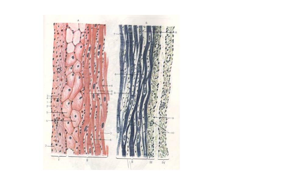 Эндокард по строению и происхождению соответствует всей стенке сосуда. В нем различают следующие слои: 3) Мышечно – эластический слой Миокард – состоит из поперечно – полосатой сердечной мышечной ткани является то, что сердечно – мышечные волокна представляют собой не симпаты, а соединенные конец в конец клетки – Кардиомиоциты. Различают типичные (сократительные, рабочие) волокна миокардасостоящие из рабочих миоцитов, и проводящие волокна, состоящие из рабочих миоцитов. Границы сердечных миоцитов образуют вставочные диски. Во вставочных дисках различают участки, служащие для прикрепления (пятно сцепления) и места, где возбуждение передастся с миоцита на миоцит, - щелевое соединение. Другими особенностями сердечных мышечных волокон является наличие анастомозов между клетками и центральное расположение ядер в кардиомиоцитах. Миофибриллы огибают ядра, оставляя свободной центральную часть цитоплазмы, где находятся митохондрии и комплекс Гольджи. Митохондрии располагаются также цепочками между миофибриоллами. Эндоплазматическая сеть не образует терминальных цистерн, как в скелетной мышечной ткани. Вместо этого формируется терминальные расширения канальцев эндоплазматичекой сети, которые принадлежат Т – трубок представляющих собой влечивание плазмапеммы Кардиомиоцитов. Проводящие миоциты образуют проводящую систему сердца, включающую синусо – предсердный узел, предсердно – желудочковый узел, предсердно – желудочковый пучок, ствол, правую и левую ножки, их ветви и проводящие мышечные волокна Пуркина. Проводящие миоциты отличаются от рабочих и друг от друга. Миоциты узла ппппппп типичных миоцитов и образуют сеть. Миоциты проводящих мышечных волокон Пуркина, крупнее типичных миоцитов. Цитоплазма проводящих миоцитов окрашивается бледнее, чем цитоплазма рабочих. Миофбриллы в ней малочисленны и не образуют общей поперечной почерченности. Цитоплазма богата