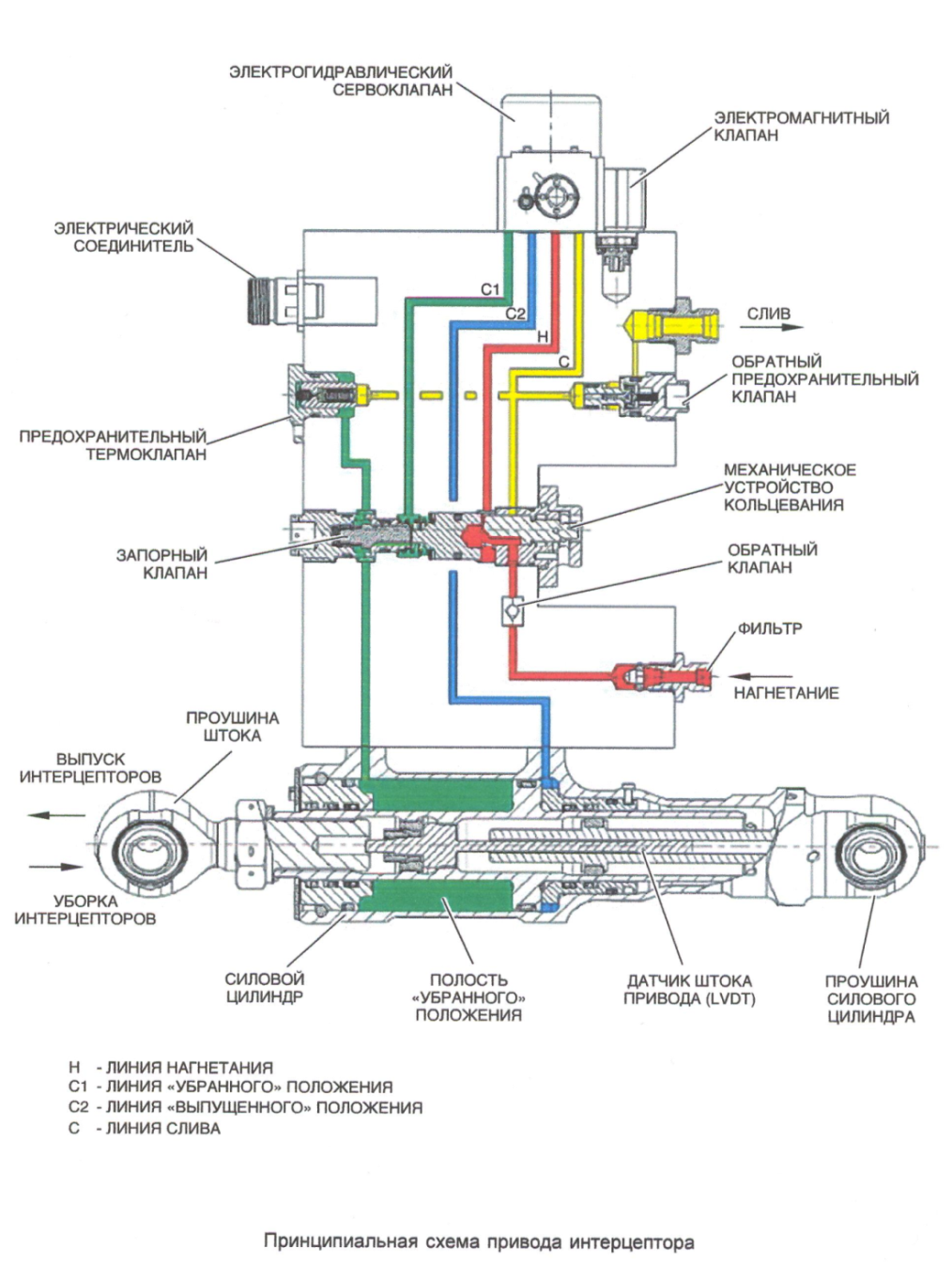 Каждая секция интерцепторов и тормозных щитков отклоняется только вверх и приводится в действие своим приводом. Диапазон углового отклонения интерцепторов — от 0° до минус 55°±1°. Тормозные щитки устанавливаются только в крайние положения: убранное (0°) и выпущенное (минус 55°±1°). Управление и интерцепторами и тормозными щитками осуществляется с помощью: — блока боковой ручки управления самолётом (БРУС) для управления интерцепторами в элеронном режиме (для поперечного управления самолётом); — блока ручки управления интерцепторами и тормозными щитками SPEED BRAKE для управление интерцепторами и тормозными щитками при работе на торможение; — блоков управления и контроля приводов; — вычислителей системы управления самолётом при функционировании системы управления интерцепторами и тормозными щитками (ТЩ) в основном режиме; — электрогидравлических сервоприводов (исполнительных органов перемещения интерцепторов и ТЩ); — блоков клапанов приводов ТЩ, осуществляющих управление приводами ТЩ. Сигналы от блоков БРУС и SPEED BRAKE обрабатываются в блоках управления и контроля и вычислителях, которые вычисляют алгоритмы управления основного режима. Интерцепторы и тормозные щитки приводятся в движение каждый одним приводом. Гидравлическое питание для приводов обеспечивают три гидравлические системы (ГС1, ГС2 и ГС3). Работа блоков клапанов построена также симметрично, т.е. один и тот же блок клапанов управляет приводами (см.Рис.4.25), например, левого внутреннего и правого внутреннего или левого внешнего и правого внешнего тормозных щитков. Управление интерцепторами и тормозными щитками осуществляется в двух режимах: основном и минимальном.