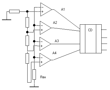 Обладают наибольшим быстродействием. В них сравнение и получение результата преобразования происходит за время . Рассмотрим схему 2–х разрядного АЦП параллельного типа.