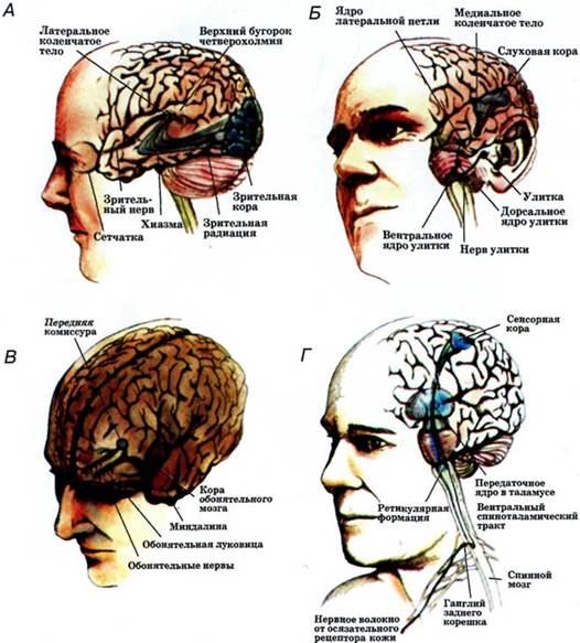 Янко Слава (Библиотека Fort/Da) || slavaaa@yandex.ru || http://yanko.lib.ru Рис. 18. Зрительная, слуховая, обонятельные системы и ощущения с поверхности тела: А - зрительная система. Показаны связи, идущие от первичных рецепторов сетчатки через передаточные ядра таламуса и гипоталамуса к первичной зрительной зоне коры; Б- слуховая система. Показаны связи, идущие от первичных рецепторов улитки через таламус к слуховой зоне коры; В - обонятельная система. Показаны связи, идущие от рецепторов слизистой носа через обонятельные луковицы и базальные ядра переднего мозга к конечным пунктам в обонятельной коре; Г- ощущения с поверхности тела. Представлены связи, идущие от кожных рецепторов через вставочные нейроны спинного мозга и таламуса к первичной сенсорной зоне коры (по Ф. Блуму, А. Лейзерсону, Л. Хофстедтеру, 1988)