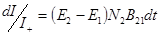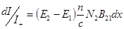 т.е. относительное изменение интенсивности излучения С другой стороны, относительное изменение интенсивности излучения за счет переходов Е2 ® Е1 пропорционально энергии этого перехода Е2 -E1, числу атомов N2, находящихся в состоянии Е2 и времени dt прохождения вынуждающего излучения через слой dх. Тогда