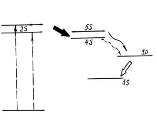 Рис.2. Обратный переход 2s - 1s с излучением фотона также запрещен правилами отбора. Возбуждение этих уровней возможно лишь за счет неупругих столкновений электронов с атомами (по схеме (10)). Уровни 5s и 4s атома неона близки по энергиям к уровням 2s гелия. При столкновении атомов гелия в состоянии 2s с атомами неона в основном состоянии происходит передача энергии от атомов гелия к атомам неона по схемам