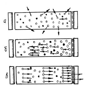 Процесс усиления излучения в резонаторе показан на рис.3 Отдельные фотоны, спонтанно излучаемые возбужденными атомами, имеют случайное направление. Эти фотоны и вызванные ими фотоны индуцированного излучения покидают активную среду, не вызывая усиления излучения вдоль оси лазера (рис.3а, пунктирные стрелки). Те же из фотонов, которые движутся вдоль оси активной среды (рис.3а, сплошная стрелка) вызывают индуцированное излучение фотона того же направления. Таким образом, число фотонов, летящих вдоль оси активной среды, растет, вовлекая в процесс индуцированного излучения все большее число возбужденных атомов. Процесс нарастает лавинообразно (рис.3б). Отражаясь от непрозрачного зеркала, это излучение вновь движется вдоль активной среды, вызывая все новые индуцированные переходы и, тем самым, увеличивая поток индуцированного излучения. При "взаимодействии" с полупрозрачным зеркалом малая часть этого излучения выходит из активной среды, а большая часть излучения вновь возвращается в активную среду и, таким образом, продолжается процесс усиления потока индуцированного излучения. При этом выход спонтанного излучения становится пренебрежимо малым. Однако, бурный лавинообразный рост интенсивности излучения возможен лишь в первые моменты времени, т.к. затем часть излучения уходит через полупрозрачное зеркало и, кроме того, уменьшается заселенность верхних уровней и увеличивается заселенность нижних уровней, что замедляет процесс. При работе в непрерывном режиме устанавливается равновесие между всеми этими процессами (излучение и возбуждение) и достигается стационарная плотность излучения лазера (рис.3в). Значительная мощность и высокая степень когерентности лазерного излучения дает возможность наглядно показать и изучить некоторые специфические свойства электромагнитных волн оптического диапазона. Поэтому лазеры нашли широкое применение в лекционных демонстрациях и лабораторных практикумах.