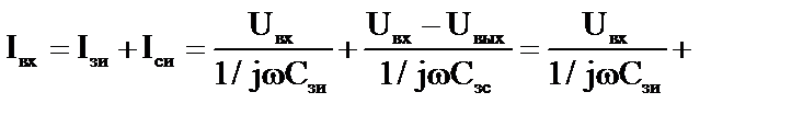 Знак минус в формуле (2) указывает на то, что входное и выходное напряжения в схеме находятся в противофазе. Поскольку при параллельном соединении сопротивлений величина эквивалентного сопротивления будет меньше меньшего из них (Rн << rc), можно упростить формулу (2). Получим: KU ≈ –Sri. (3) Входное сопротивление на низких частотах создает только Rз, что видно из эквивалентной схемы. Следовательно, Rвх = Rз = 1 МОм для всех вариантов. Выходное сопротивление схемы определяется параллельным соединением Rн и rc. Учитывая замечание к формуле (2), имеем Rвых = Rн//rc» Rн. Входная емкость устройства определяется из следующих соображений. На рис. 3 представлены емкостные токи, которые на высоких частотах значительно превышают токи, проходящие через резисторы эквивалентной схемы и внутреннее сопротивление источника тока, поскольку они значительны по величине. Следовательно,