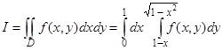 Пример 15. В двойном интеграле Область интегрирования является сегментом круга х2 + у2 = 1, отсекаемым прямой х + у = 1 (рис. 30). В прямоугольных декартовых координатах данный двойной интеграл сводится к повторному
