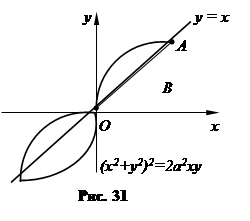 Пример 17. Перейдя к полярным координатам, вычислить Область интегрирования ограничена дугой лемнискаты Бернулли и отрезком прямой у = х (см. рис. 31, область ОАВ). Границы области в полярных координатах х = rcosj, у = rsinj:
