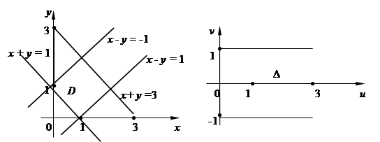 Область D плоскости Оху при преобразовании (18) перейдет в некоторую область D плоскости Ouv, границы которой будут: u = 0, u = 2, v = 0, v = 2. Эти равенства получены из уравнений х = 0, у = 0, х + у = 2 и формул (18). Действительно, если х = 0, то u (2 – v) = 0, откуда u = 0, v = 2; если у = 0, то u = 0, v = 0; если х + у = 2, то u = x + y = 2, u = 2. Область D в плоскости Ouv является прямоугольником (рис. 32).